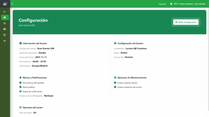 Desde el panel web puede gestionar eventos, listados, incidencias y estadísticas en tiempo real. También puede configurar los datos del evento, el diseño de acreditaciones y certificados, y exportar informes de asistencia o lecturas.