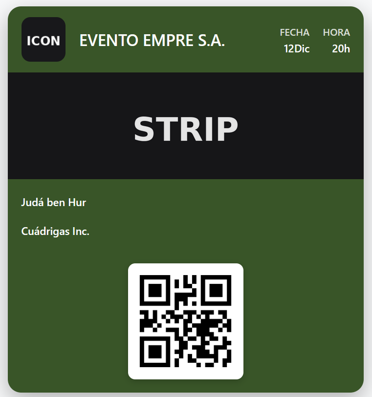 Es lo mismo que se usa para los tickets de vuelo, por lo que hemos elegido ese formato más atractivo "boarding pass" con "banda strip" (resolución 750x246 píxeles) e icono superior (87x87 píxeles) para generar los ficheros de Apple wallet para los tickets de eventos.