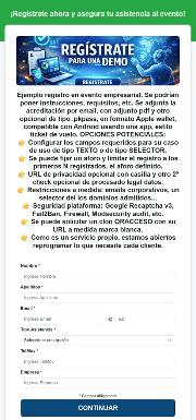 Se puede activar un web de registro asociado a cada evento opcionalmente, en el caso de que se requiera. La respuesta es OPCIONAL, por email con la plantilla configurada para generar el ticket/gafete y/o por SMS. También se ofrece un enlace de descarga del PDF con el ticket, por lo que tanto el email como el móvil son opcionales o pueden dejarse como de tipo "texto", aunque no es lo normal. Repito que todo lo que ofrecemos son desarrollos propios, por lo que podemos adaptarlos rápido a las necesidades de nuestros clientes.